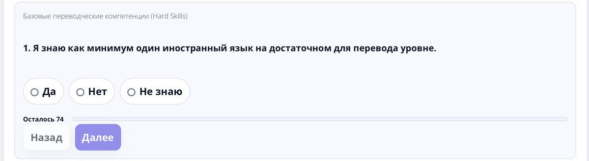 - Назад / Далее — навигация по вопросам. «Далее» активна только после выбора ответа.