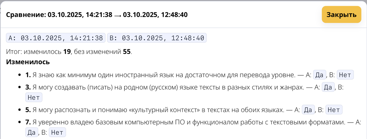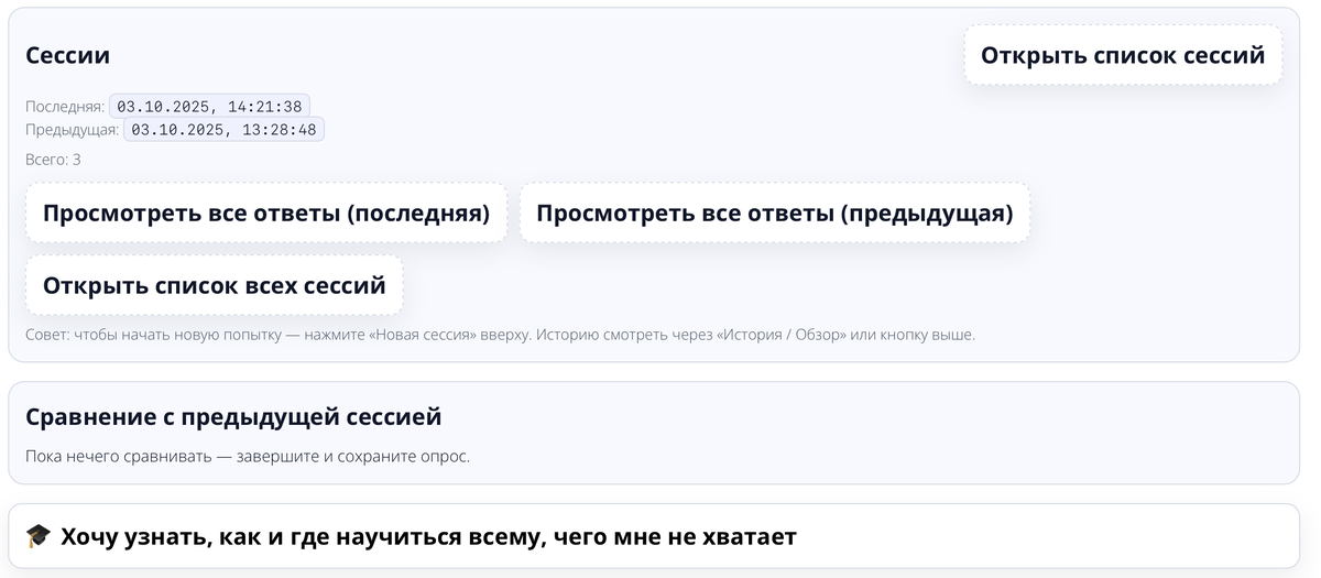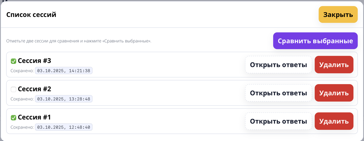 Кроме того, после каждого сохранения на главной странице автоматика показывает блок «Сравнение с предыдущей сессией» — там видно, сколько ответов изменилось.