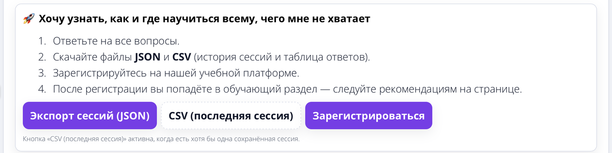 - CSV (в окне обзора) — скачать ответы текущей показанной сессии в виде таблицы.