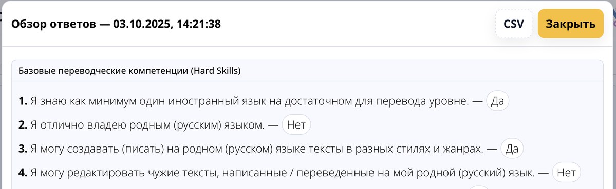 - Нажмите CSV (вверху справа) — скачается таблица с колонками «№ / Section / Question / Answer».